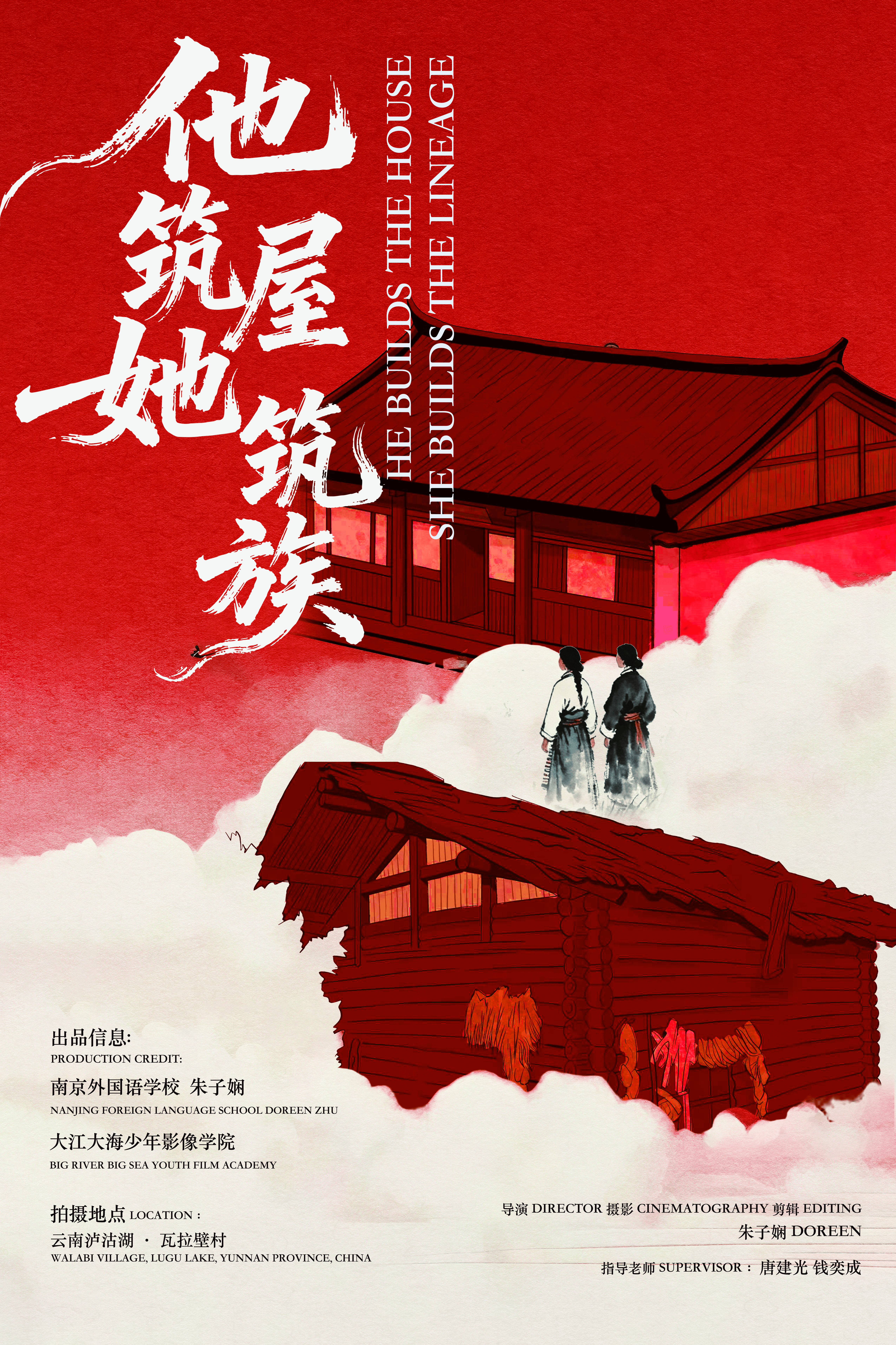 《他筑屋,她筑族He Builds the House, She Builds the Lineage 》海报灵感来源于这场关于祖母屋的搬迁。摩梭男女并肩站立在旧祖母屋的屋檐上向远方眺望,而远方是他们即将建成的新祖母屋。男女并肩姿态寓意着摩梭族男女平等,分工合作的传统。他们注视着远方兴建的新祖母屋则是摩梭人对未来生活的美好向往以及期盼。这一情景所承载的象征意义,构成了我创作海报的核心灵感来源。